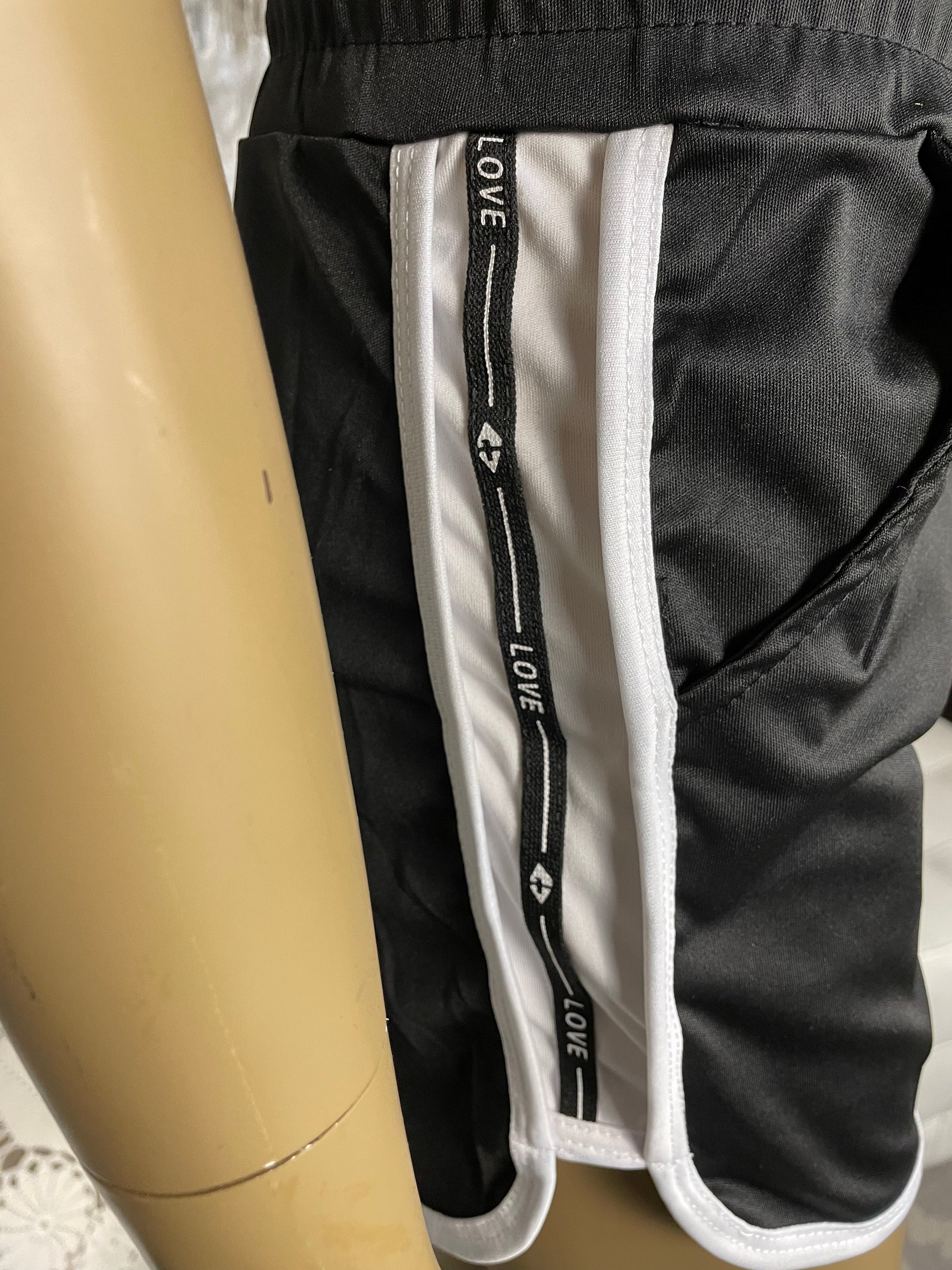 These jogger shorts have a drawstring waistband to adjust the size of the waist. It has a cute statement of love on the side stripe.