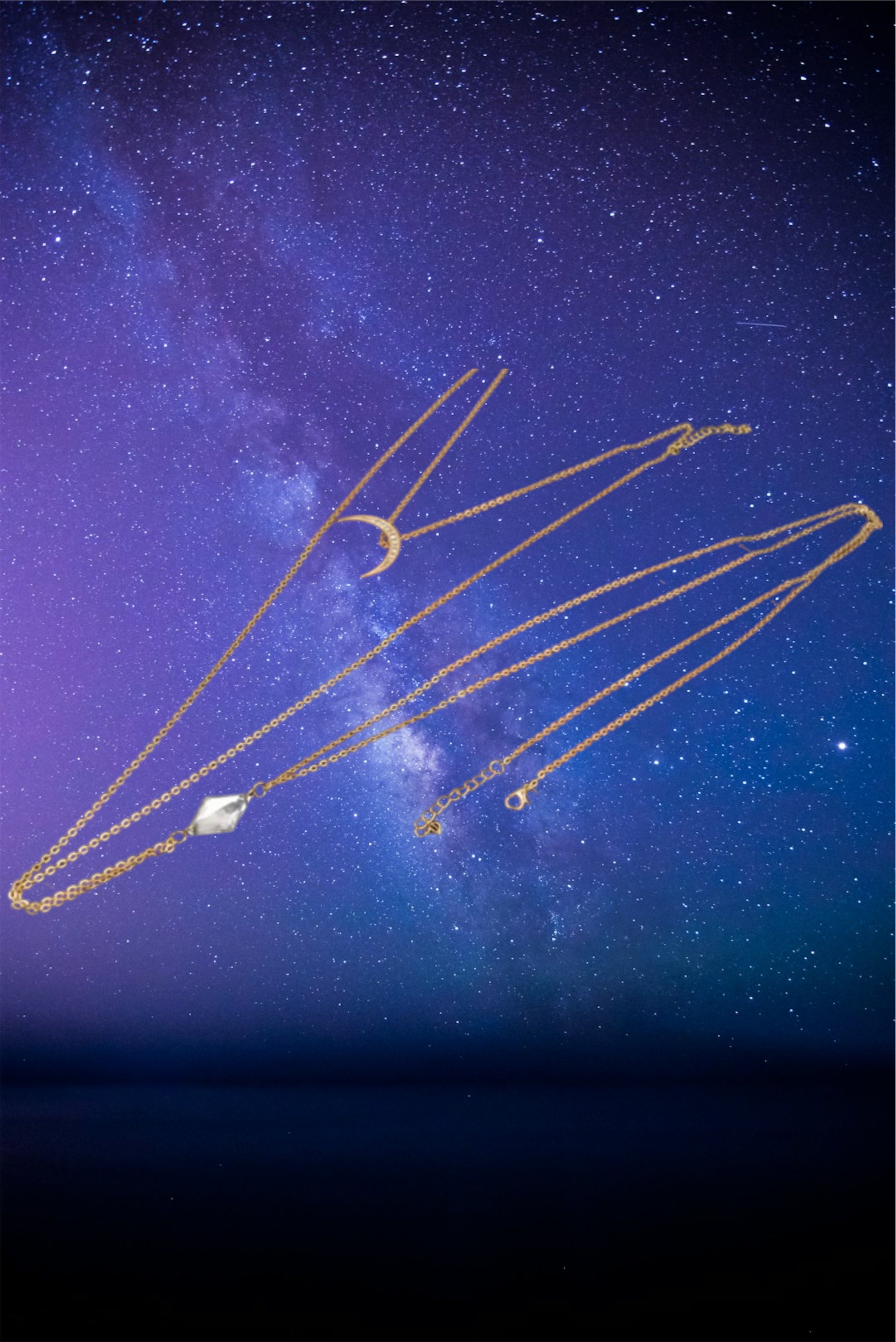 This piece is one of our favorites. The moon pendant accents the neck and the chain drops down to a rhinestone.