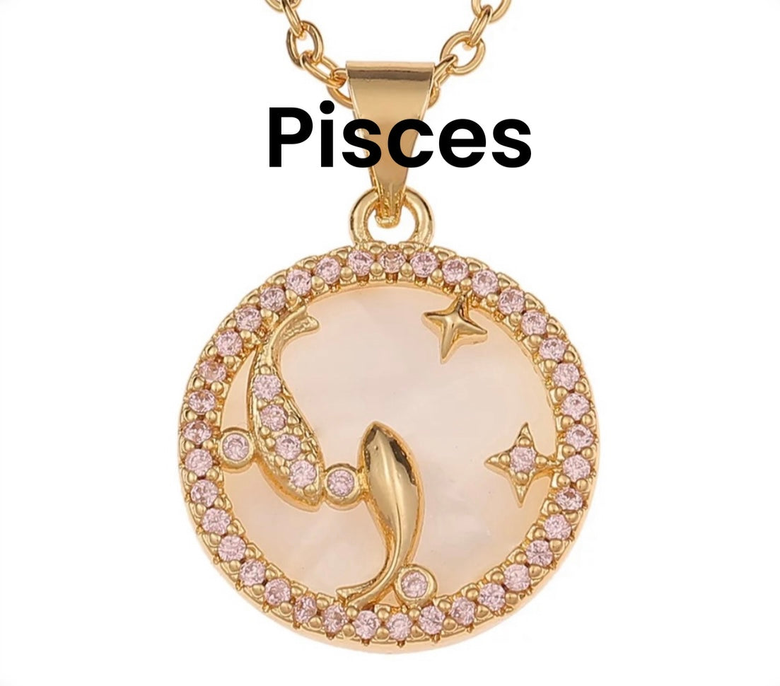 These are 18 k gold plated horoscope necklaces. They are embellished with rhinestones. These are great to combine with our other tarot and horoscope necklaces.