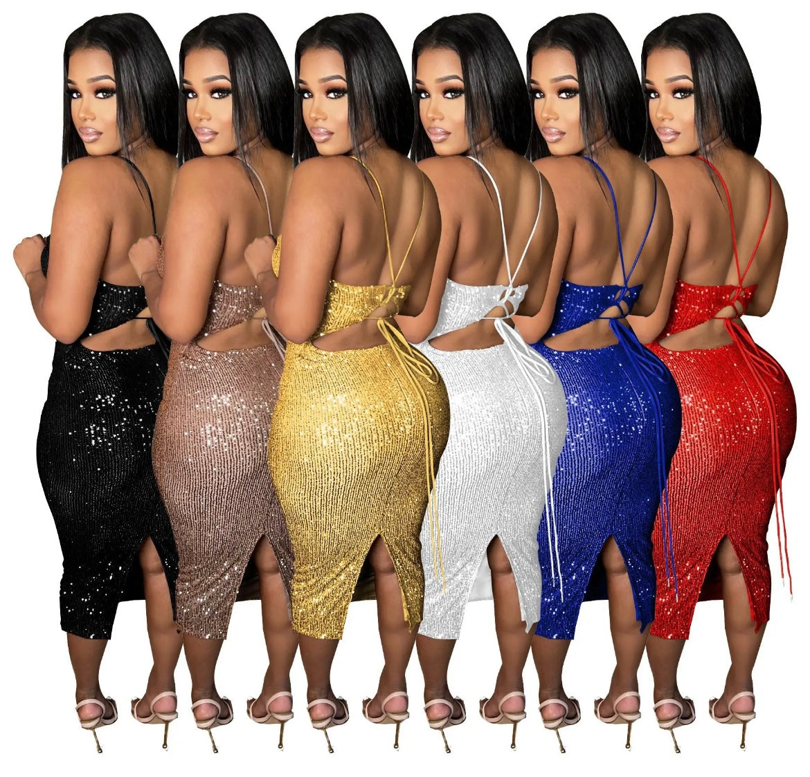 This dress is sexy and stylish. It is body hugging and shows off your curves. The back is a criss cross tie. It has a slit in the back.