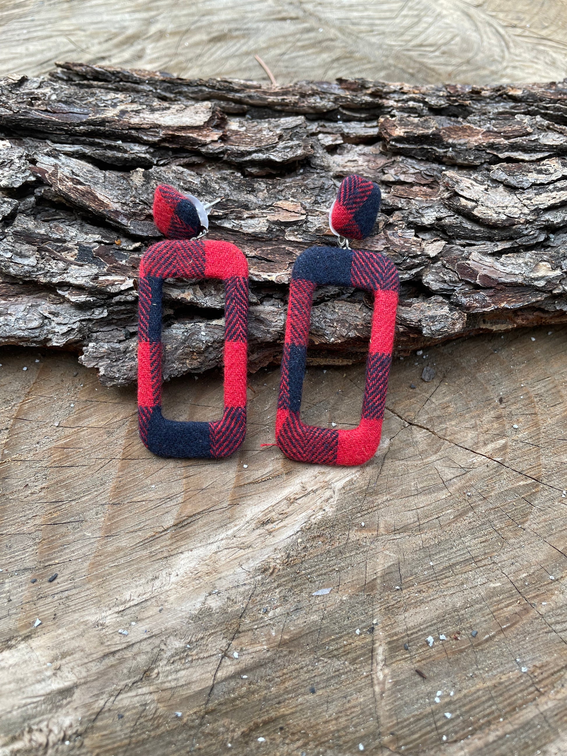 These earrings are shaped in a rectangle. They are covered by plaid fabric. Lightweight they will not weigh on your earlobes. The other style resemble snake skin.