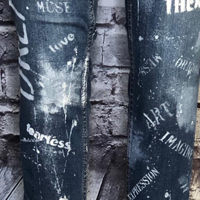 Uplifting phrases and inspirational words give these one-of-a-kind jeans a new life! Upcycled from salvaged denim, they are designed to be a reminder of life's positivity. I added a distressed look, and 'grunged' them up a bit with white fabric paint.
