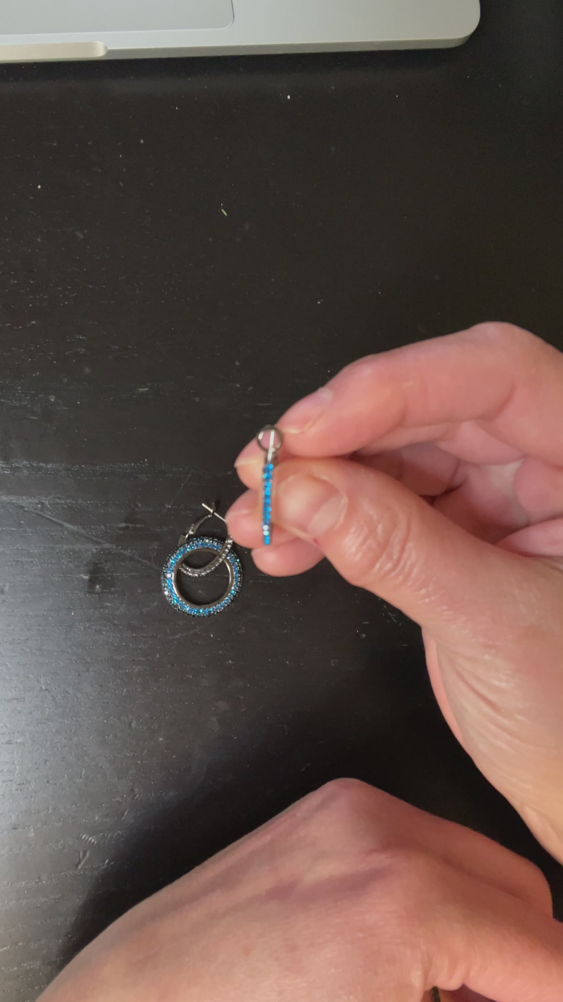These earrings are embellished with sparkly rhinestones. You can wear these two ways. Wear both pieces together or separate them to wear just the top portion. Please refer to the picture below.